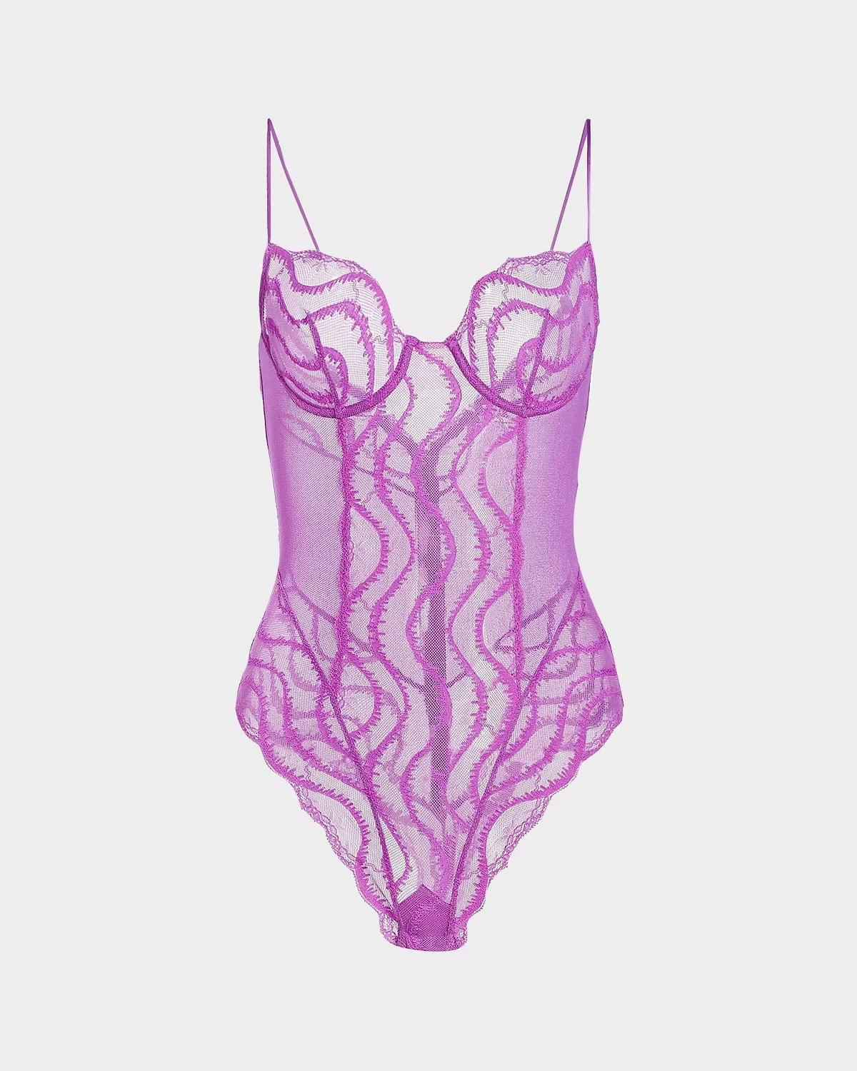 Kiki De Montparnasse "Leche Moi" tulle bodysuit with tonal embroidery and scalloped edges Scoop neckline Underwire cups Sleeveless Adjustable straps Minimal seat coverage Formfitting Invisible back zipper Polyester/elastane Made in the USA Model is 5'10"/177cm.