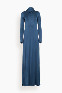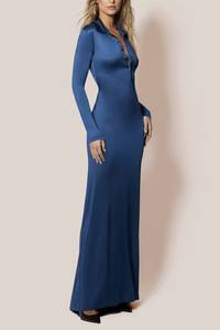 The Kiki de Montparnasse Liquid Contour Buttondown Shirtdress in French Navy is crafted from Austrian satin-faced viscose jersey, designed to move like liquid over the body for a flawless, sculpted fit. Its fitted silhouette highlights the body, while the train enhances drama. FIT DETAILS - Austrian Satin Faced - Viscose Jersey - Italian Mother of Pearl Logo Buttons - Self 93% Viscose, 7% Lycra - Dry Clean Only
