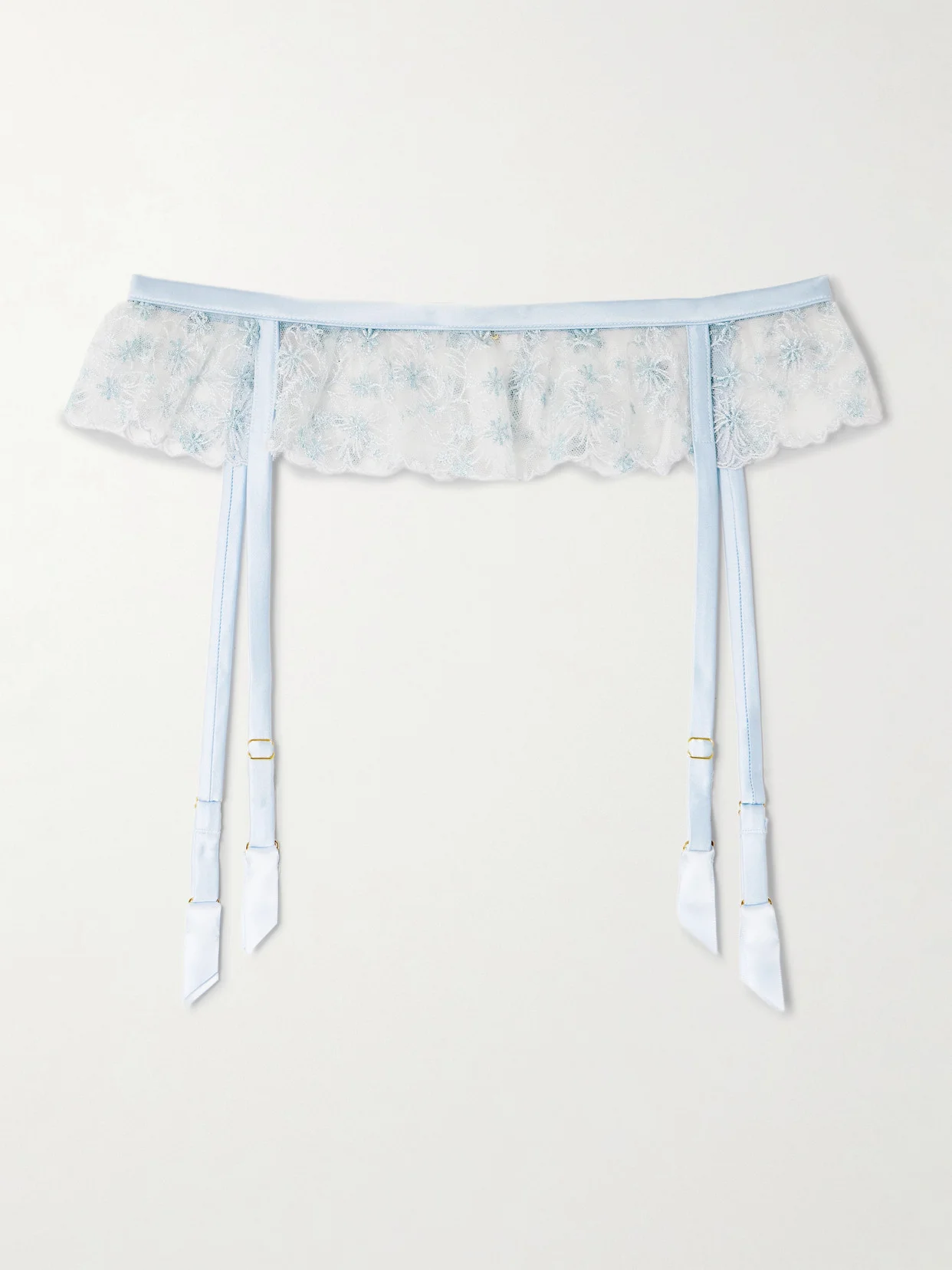 Kiki de Montparnasse's 'Mathilde' suspender belt is meant to be worn with the coordinating bra and thong. Made from tulle, it's traced with lustrous silk-blend satin in a pretty light-blue and has matching flowers embroidered throughout. Flecks of silver give the intricate details a soft glow.