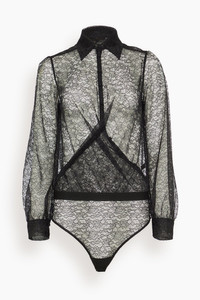 The Kiki de Montparnasse Petite Fleur Crossover Bodysuit in Black adds the provocative, statement-making allure of lace to any look. This collared bodysuit features a draped crossover front and button cuffs. FIT DETAILS - Lace Body - Long sleeves - Collar - Button placket - Crossover front - 100% Polyamide - Dry Clean Only