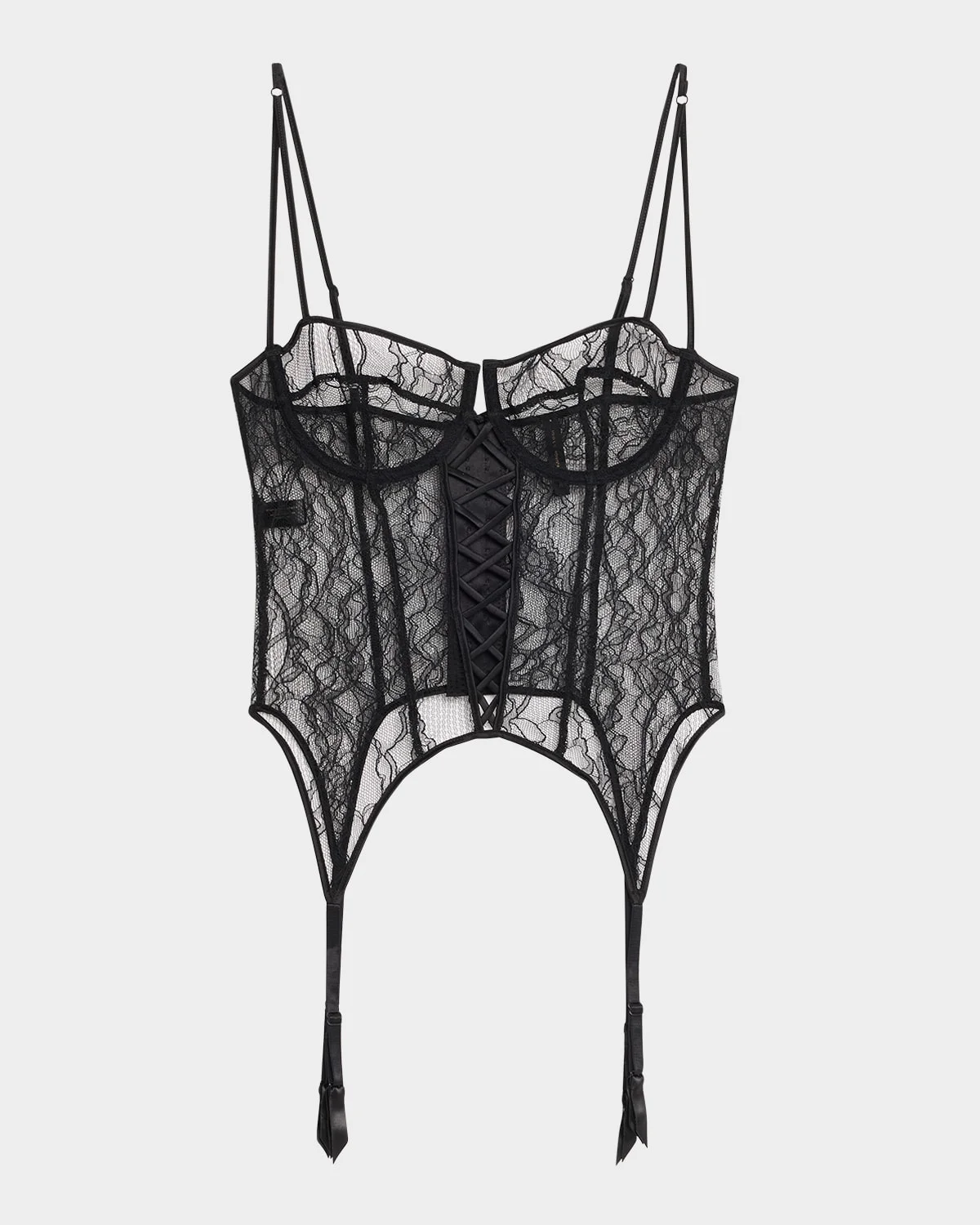 Kiki De Montparnasse "Precieuse" bustier in lace with laceup detailing and attached adjustable garter straps Underwire twopart demi cups Adjustable shoulder straps Formfitting Hookandeye back closure Nylon/polyamide/elastane Imported