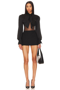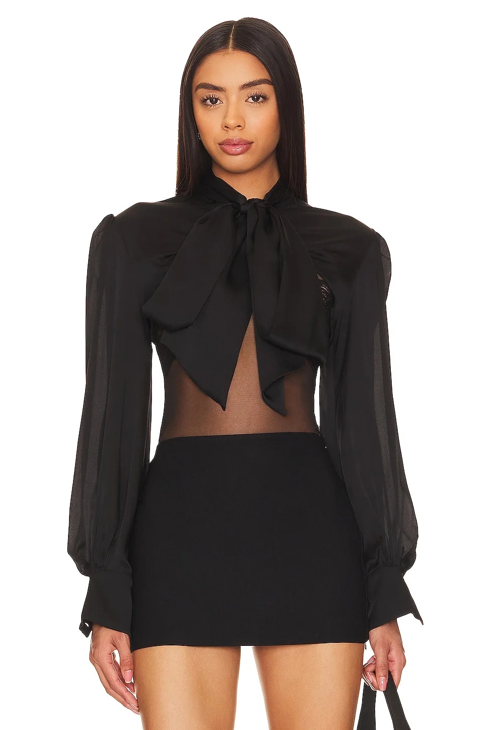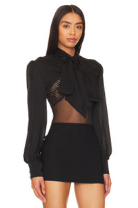 - 100% silk - Made in China - Dry clean only - Dual front button loop closure - Puff sleeves with button cuffs - Satin fabric with draped neck tie - Item not sold as set - Revolve Style No. KIDE-WS17 - Manufacturer Style No. C002TP052
