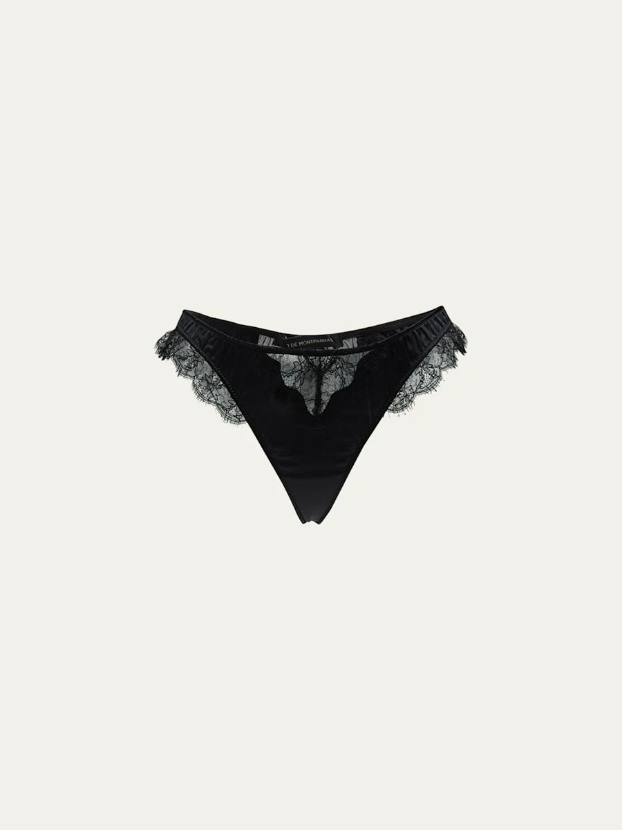 Kiki De Montparnasse "Sensuel" satin thong with lace trim. Low rise; sits at hips. Scalloped edges at leg openings. Minimal seat coverage. Silk/Lycra® spandex. Rayon/nylon lace. Hand wash. Made in USA of French materials.