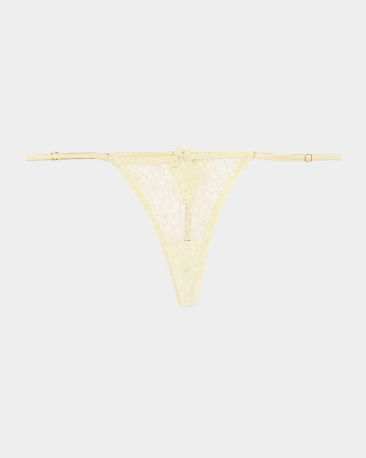 Kiki De Montparnasse "Vinca" gstring in French lace and silk charmeuse, decorated with glittering beads Lowrise sits low on the hips Adjustable side straps Minimal seat coverage Cotton/nylon/polyamide/silk Dry clean Made in the USA