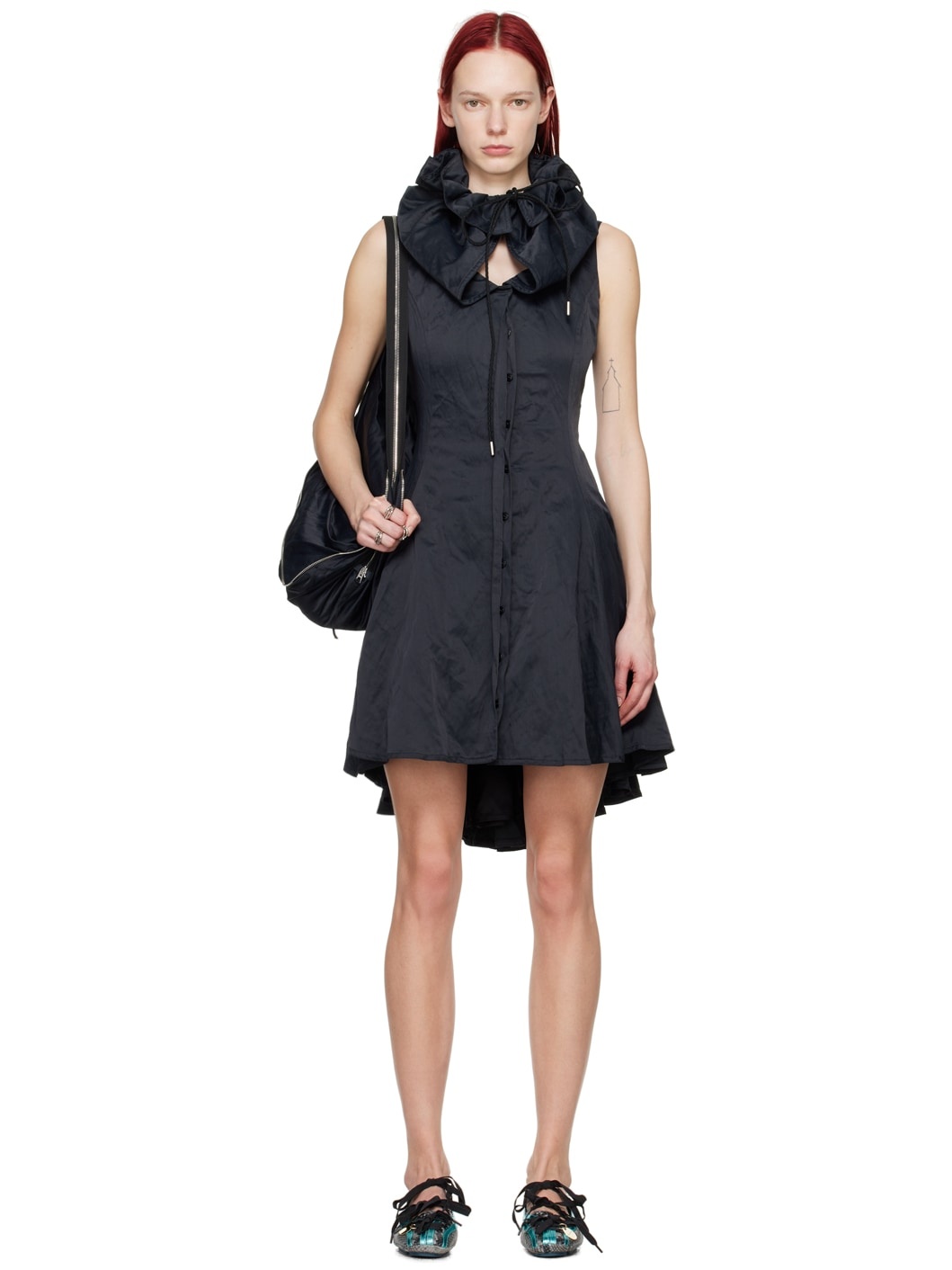 Crinkled nylon- and cotton-blend twill dress. Gathering, patch pocket, and self-tie fastening at detachable zip pouch. · Metallic thread detailing throughout · Drawstring at sailor collar · Concealed button closure · Asymmetric hem · Elasticized trim at back hem · Full slip-style viscose twill lining Supplier color: Pebble black Body: 47% polyamide, 46% cotton, 7% metallic fibre. Lining 1: 100% cotton. Lining 2: 100% viscose. Made in Bulgaria 241985F052004