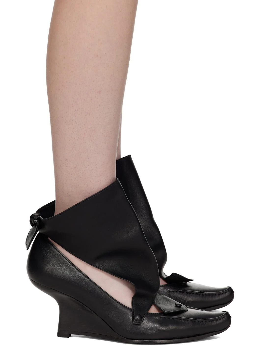Nappa leather heels. · Moc toe · Detachable trim with bow accent at vamp · Stacked wood wedge heel with rubber injection · Leather sole with rubber injection · Heel: H3.25" Supplier color: Eclipse black Upper: leather. Sole: wood, leather. Made in Italy 252985F122000
