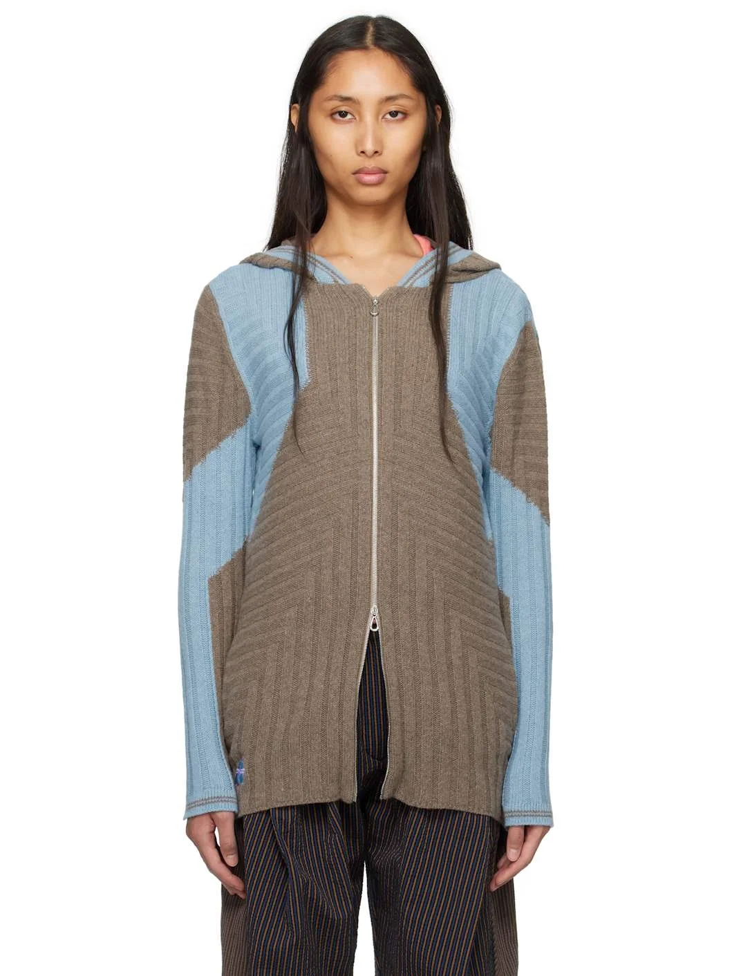 Rib-knit cashmere- and wool-blend hoodie. · Paneled construction · Striped trim at hood and cuffs · Two-way zip closure · Seam pockets at front · Embroidered logo patch at front hem Supplier color: Sepia/Celeste blue 97% cashmere, 3% wool. Made in Bulgaria 251985F097002