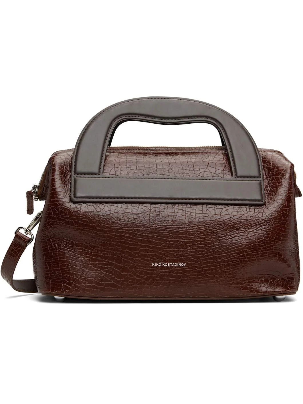 Crackled patent calfskin and buffed goatskin top handle bag. · Twin carry handles · Adjustable and detachable shoulder strap · Logo stamp at face · Bumper studs at base · Two-way zip closure · Patch pocket at interior · Twill lining · H8.5" x W13" x D6" Supplier color: Cracked brown Calfskin, goatskin. Made in Italy 252985F046000