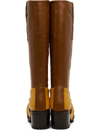 Handcrafted mid-calf nappa calfskin boots in brown and yellow. · Knotted accent at vamp · Logo embossed at inner side · Pull-loops at collar · Buffed leather lining · Stacked leather midsole and block heel · Treaded rubber sole · Heel: H2.5" Supplier color: Rhum/Mustard/Brown Upper: calfskin. Sole: leather, rubber. Made in Spain 242985F114001