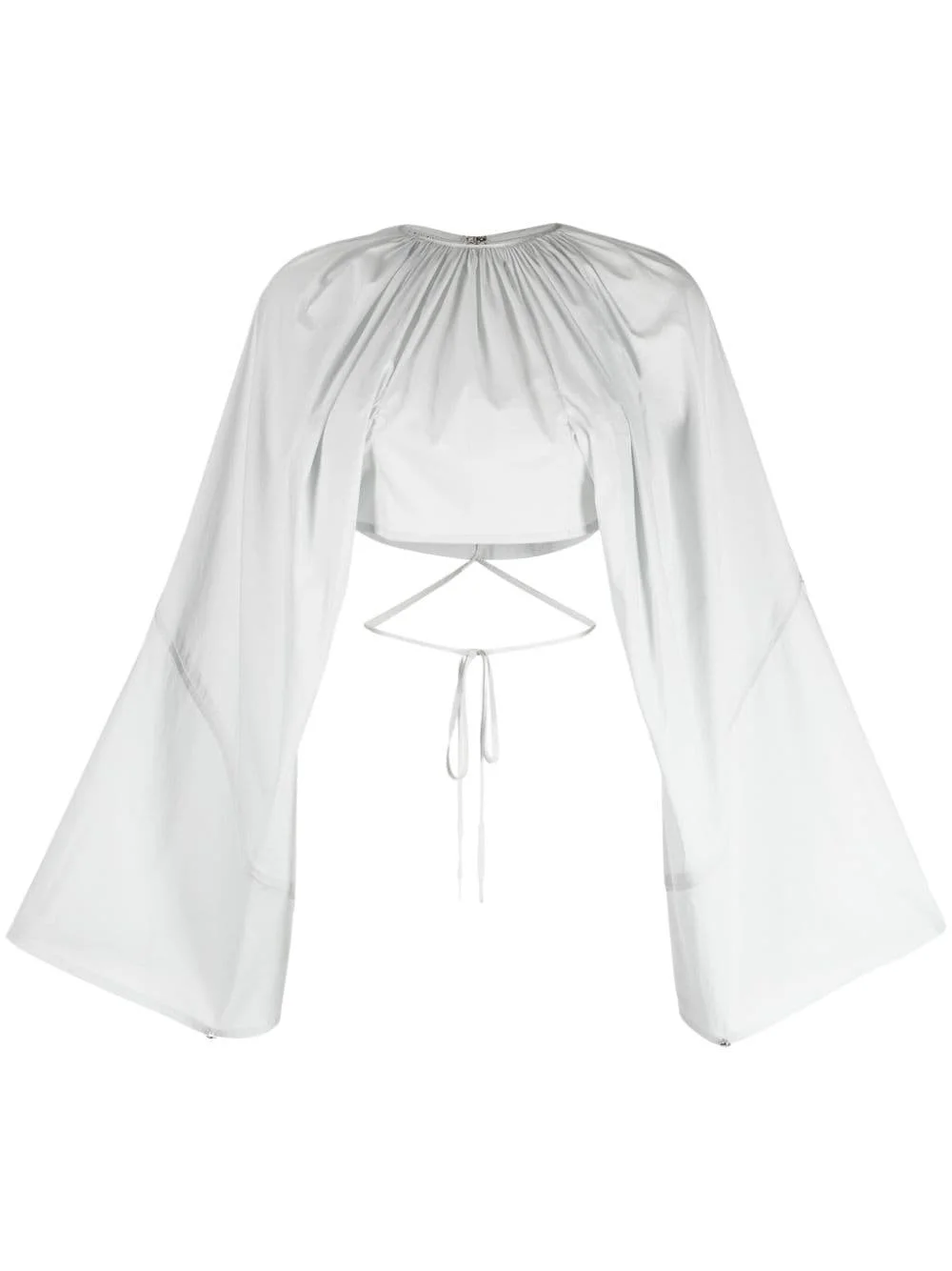 gathered-detail cropped blouse Highlights - Light grey - Cotton blend - Stretch-design - Gathered detailing - Gathered neckline - Round neck - Rear hook and eye fastening - Tie-fastening straps - Long wide sleeves - Cropped - Curved hem Imported Composition Body: Cotton 72%, Polyamide 25%, Elastane 3% Washing instructions Dry Clean Only