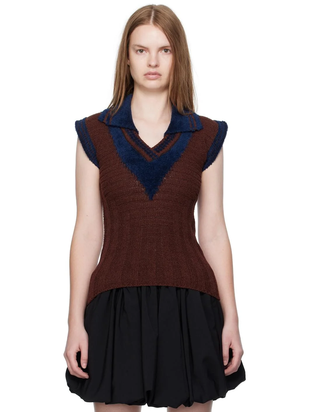 Rib-knit silk and cotton-blend fleece polo. Striped spread collar, V-neck, and armscyes. Supplier color: Mahogany brown Body 1: 73% cotton, 27% polyamide. Body 2: 100% silk. Made in Bulgaria 252985F100000