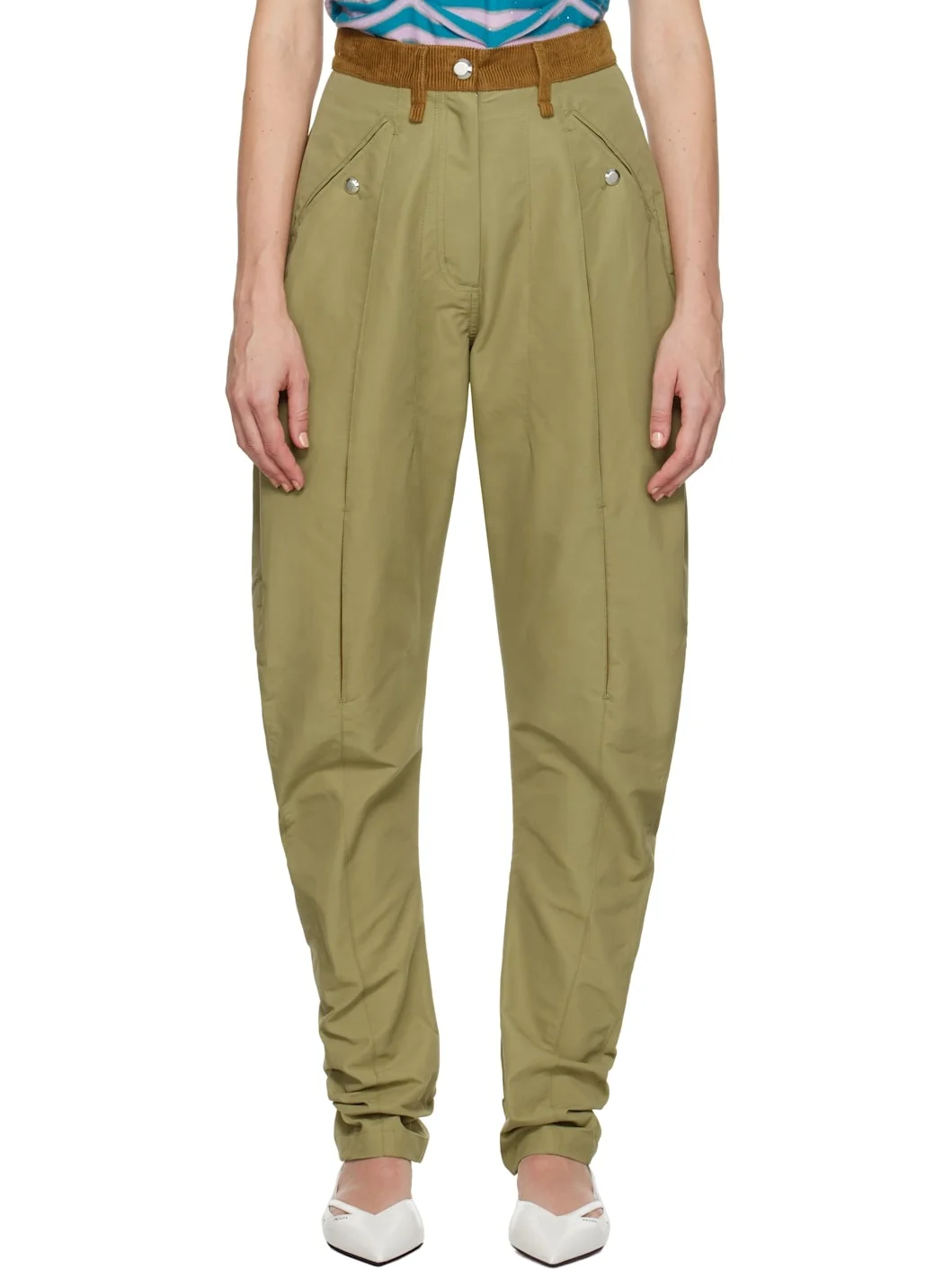 Tapered cotton-blend faille trousers. Cotton corduroy trim and inverted pleats throughout. · Paneled construction · Belt loops · Four-pocket styling · Zip-fly · Two-way zip pocket at back Supplier color: Olive green/Honey Body 1: 57% cotton, 43% polyamide. Body 2: 100% cotton. Lining: 100% cotton. Made in Bulgaria 242985F087005