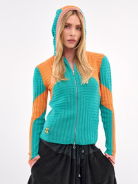 KIKO KOSTADINOV hoodie in turquoise & orange, paneled knit construction, two-tone jacquard knit, rib-knit, hood, front exposed two-way zip closure, long sleeves, hem logo embroidery, curved hem, slim fit. French Sizing Model is 5'8" wearing size 36. Bust: 32" Waist: 24" Hips: 35"
