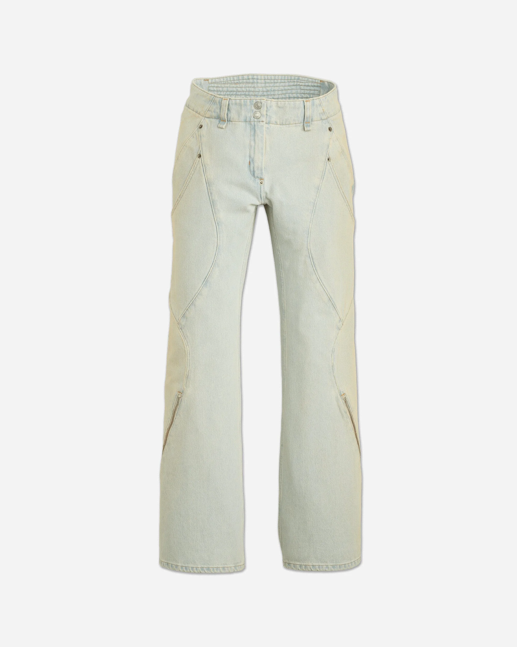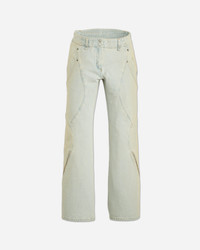 Levi’s® x Kiko Kostadinov Carina Flared Jeans Light Indigo Wash The Levi’s® x Kiko Kostadinov features a transformative godet zipper detail at the hem, when unzipped the bottom hem opens to create a loose, flared silhouette, allowing the wearer to alter the garment's fit and attitude. Additional details include double side pocket entries, two center front snaps at the waistband, an exposed rivet at the bottom fly, one back pocket with zipper closure, and trapunto stitching at the back waistband–ensuring each garment is unique. - 100% Cotton - Non-Stretch Denim - Loose Fit - Flared Leg - Button Closure - Zip-Fly - Two Side Pockets - One Back Zip Pocket - Zipped Hem - Style Code: 003IP0001 2