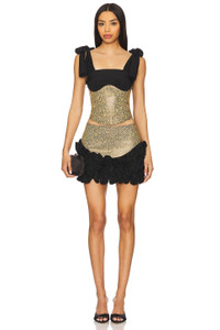 - 100% nylon - Machine wash - Fully lined - Hidden side zip closure - Ruched skirt - Midweight faux leather with floral design - Item not sold as a set - Skirt measures approx 12.5" in length - Revolve Style No. KIMR-WQ34 - Manufacturer Style No. KS2025SS05