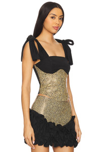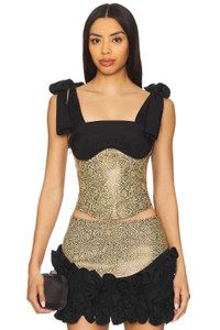 - 100% nylon - Machine wash - Back lace-up tie closure - Tie shoulder straps - Midweight faux leather fabric with floral design - Item not sold as a set - Revolve Style No. KIMR-WS63 - Manufacturer Style No. KS2025SS04