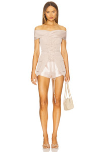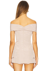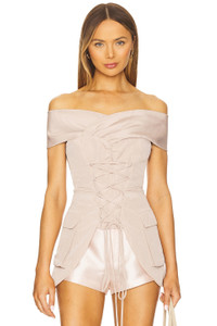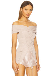 - 75% rayon 25% silk - Dry clean only - Hidden back zip closure - Front lace-up tie closure - Off the shoulder styling - Front flap pockets - Midweight crepe fabric - Revolve Style No. KIMR-WS67 - Manufacturer Style No. KS2025SS66