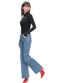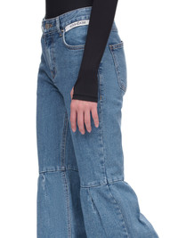 KIMHĒKIM pants in blue, wash denim, button zip fastening, five pocket, branded label detail, belt loops, mid-waist, flared hem, fitted. US Sizing Composition: 100% Cotton Model is 5'9" and is wearing size 25. Bust: 32" Waist: 24" Hip: 34"