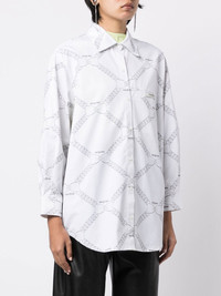 chain-link print shirt optical white cotton chain-link print classic collar long sleeves front button placket Imported Composition Body: Cotton 100% SIZE & FIT Model measurements Height 5 ft 10 in(1.77 m) Bust/Chest 31.49 in(80 cm) Hips 35.43 in(90 cm) Waist 25.19 in(64 cm) FittingInformation This piece fits true to size. We recommend you get your regular size Cut for a loose fit Made with a mid-weight non-stretch fabric