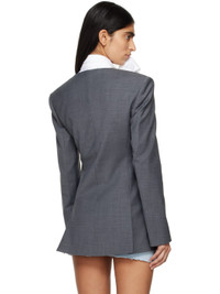 Stretch wool-blend delaine blazer. · Y-neck · Concealed button closure · Flap pockets · Padded shoulders · Twin vents at back hem · Full satin lining Supplier color: Grey Body: 80% wool, 18% polyester, 2% spandex. Lining: 100% polyester. Made in South Korea 241609F057001