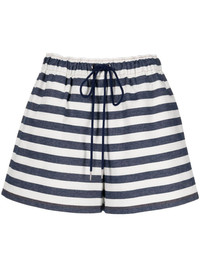 stripe-print drawstring shorts Highlights - Navy blue/white - Cotton - Stripe print - Elasticated drawstring waistband - Slip pockets to the sides - Wide leg Imported Composition Cotton 100% SIZE & FIT Model measurements Height 5 ft 9 in(1.75 m) Bust/Chest 31.88 in(81 cm) Hips 35.03 in(89 cm) Waist 23.22 in(59 cm) FittingInformation Designed for a relaxed, roomy fit Adjust this piece’s waistband to your preference using the drawstring Sturdy and hard-wearing, this denim piece offers no stretch This piece fits true to size – take your usual size