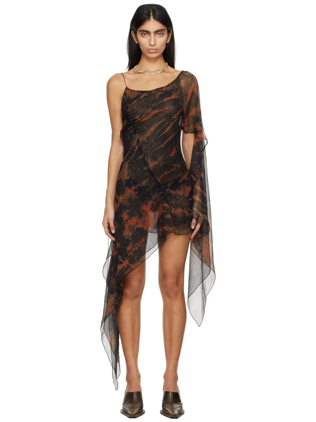 Handcrafted silk crepon dress. Graphic pattern printed throughout. · Asymmetric, layered, and draped construction · Cord-lock spaghetti strap Supplier color: Acid flame 100% silk. Made in United Kingdom 241148F052013