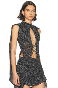 Details - 100% polyester - Made in United Kingdom - Machine wash - Front lace-up closure - Back button loop closure with keyhole design - Front cut-out detail - Extended fabric at sleeves - Crepe fabric with side slits - Item not sold as a set - Our Style No. KNLF-WS18 - Manufacturer Style No. SS25-ALBL0DAISY
