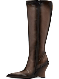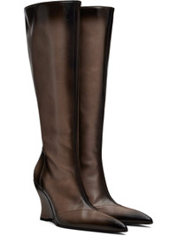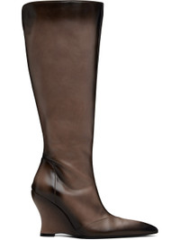 Knee-high buffed calfskin boots. · Fading throughout · Pointed toe · Vented collar · Zip closure at inner side · Covered wedge heel with rubber injection · Leather sole · Heel: H4" Supplier color: Grey Upper: calfskin. Sole: leather, rubber. Made in Italy 252148F115001