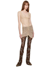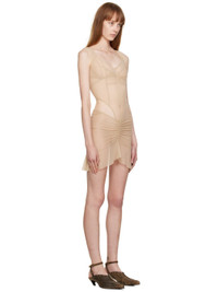 Sheer stretch nylon mesh dress. Ruching throughout. · Paneled construction · Scoop neck · Cutouts at waist · Raw edge at hem Supplier color: Beige