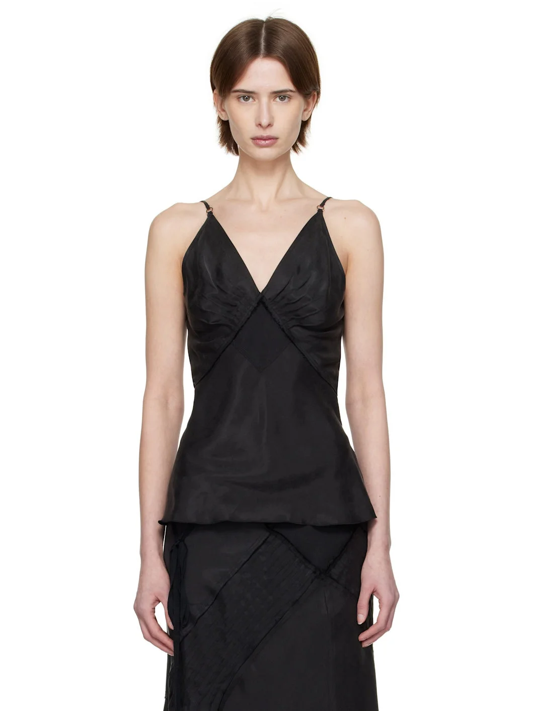 Bias-cut tencel twill tank top. Draping throughout. · Plunging V-neck · Pleats at cups · Trim with raw edge at chest · Integrated self-tie bow accent at back · Adjustable spaghetti straps · Low back Supplier color: Black 100% tencel. Made in United Kingdom 251148F111000