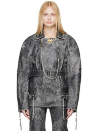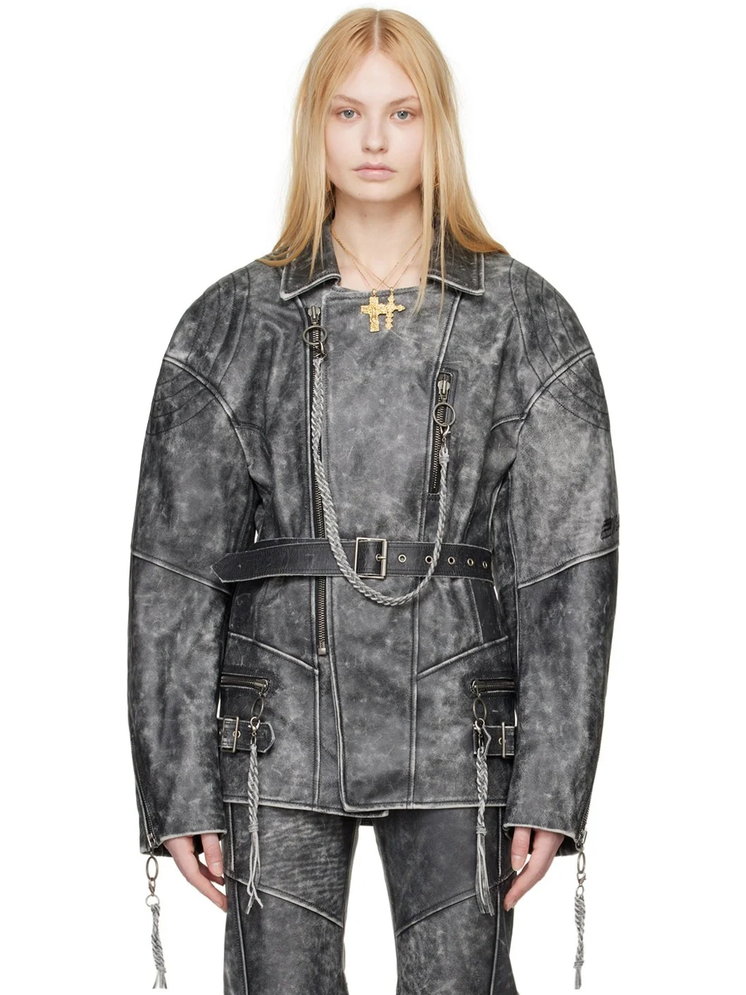 Grained leather jacket. Fading and distressing throughout. · Spread collar · Double-breasted zip closure · Zip pocket · Detachable braided tassels at front and cuffs · Detachable pin-buckle belt · Press-stud placket at front hem · Zip pocket and pin-buckle strap at side seams · Quilted detailing at dropped shoulders · Logo embossed at sleeve · Zip vent at cuffs · Full acetate-blend satin lining Supplier color: Moto black Body: 100% leather. Lining: 68% acetate, 32% polybutylene terephthalate elite. Made in Italy 241148F064001