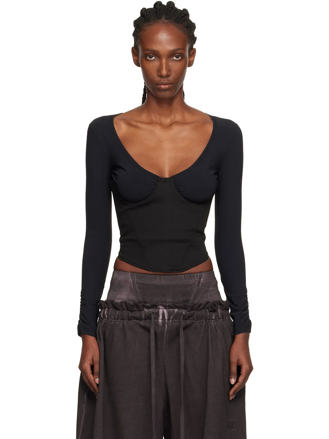 Stretch cotton twill and stretch nylon jersey top. · Paneled construction · Scoop neck · Curved hem · Ruching at cuffs · Zip closure at side seam Supplier color: Black Body 1: 98% cotton, 2% polyurethane. Body 2: 75% polyamide, 25% elastane. Made in United Kingdom 252148F111001