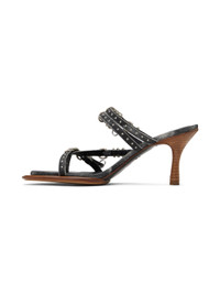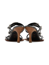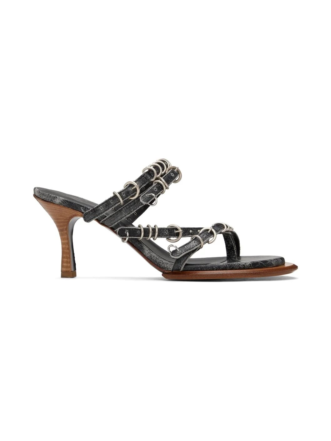 Buffed leather heeled sandals in black. Distressing, rivets, and hardware detailing throughout. · Open toe · Adjustable thong-style strap · Adjustable pin-buckle straps at vamp · Logo embossed at padded leather footbed · Kitten heel with rubber injection · Polished leather sole · Heel: H3" Supplier color: Moto grey Upper: leather. Sole: leather, rubber. Made in Italy 241148F125001