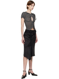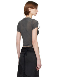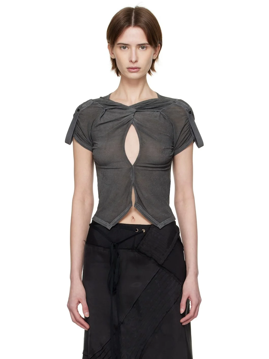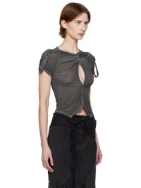 Semi-sheer stretch viscose jersey T-shirt. Fading, draping, and gathering throughout. · Twisted detailing at V-neck · Cutout at front · Asymmetrical hem · Button-fastened webbing trim at sleeves Supplier color: Washed black 94% viscose, 6% elastane. Made in Portugal 251148F110000