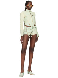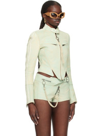 Cracked lambskin jacket. Fading and distressing throughout. · Adjustable press-stud tab at band collar · Detachable braided tassel at zip closure · Logo embossed at chest · Zip pockets · Twin vents at asymmetric hem · Padded shoulders · Striped suede trim at sleeves · Zip vent at cuffs · Full cupro satin lining Supplier color: Moto teal Body: 100% lambskin. Lining: 100% cupro. Made in Italy 241148F064002