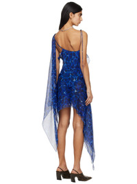 Handcrafted silk crepon dress. Graphic pattern printed throughout. · Asymmetric, layered, and draped construction · Cord-lock spaghetti strap Supplier color: Aqua leo