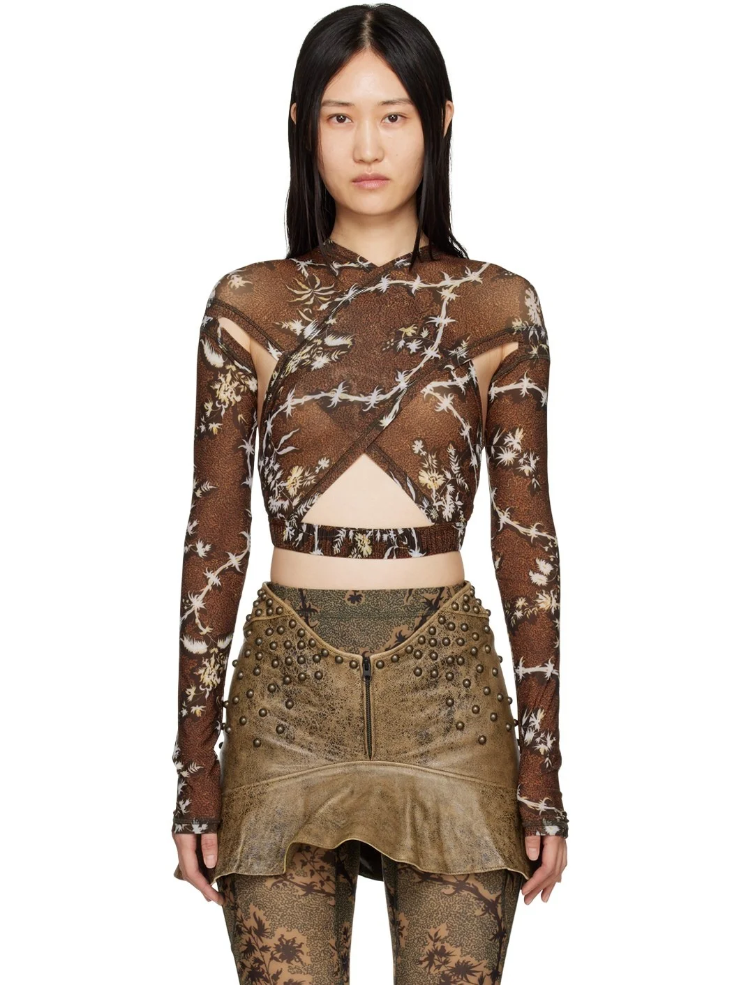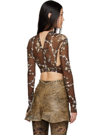 Semi-sheer stretch polyester jersey blouse. Graphic pattern printed throughout. · Layered construction · Criss-crossing straps at front · Cutout at armscyes and elasticized hem Supplier color: Thorny Brown 84% polyester, 16% elastane. Made in Italy 222148F107004