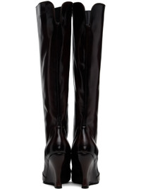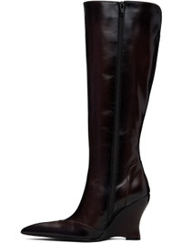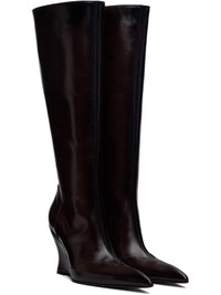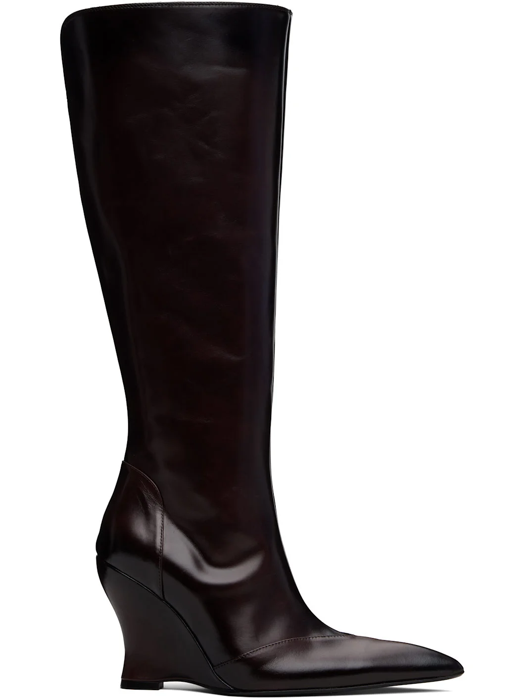 Knee-high buffed calfskin boots. · Pointed toe · Vented collar · Zip closure at inner side · Covered wedge heel with rubber injection · Leather sole · Heel: H4" Supplier color: Espresso Upper: calfskin. Sole: leather, rubber. Made in Italy 252148F115002