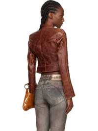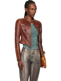 Grained lambskin jacket. · Stand collar · Zip closure · Zip pockets at chest · Curved hem · Stripe appliques at sleeves · Zip vent at cuffs · Full satin lining Supplier color: Rust Body: 100% lambskin. Lining: 100% cotton. Made in Turkey 252148F064001