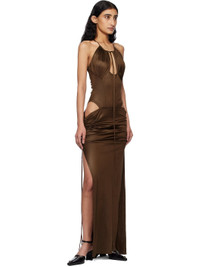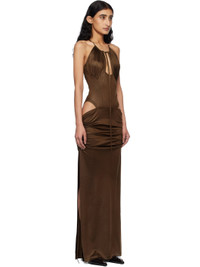 Stretch acetate-blend jersey maxi dress. Gathering throughout. · Bungee-style drawstring at halter neck · Cutouts at chest and waist · Bungee-style drawstring at elasticized side seams · Slit at sides Supplier color: Brown burn 70% acetate, 30% polyamide. Made in Portugal 251148F055001