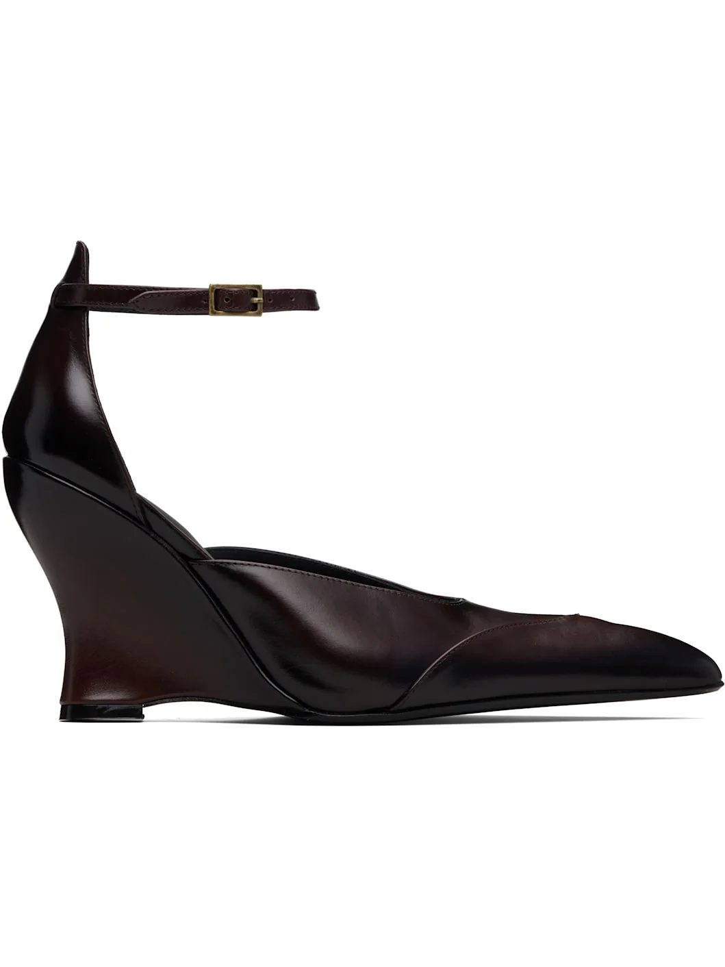 Handcrafted grained calfskin heels. · Gradient throughout · Pointed toe · Pin-buckle ankle strap · Covered modified wedge heel · Leather sole with rubber injection · Heel: H4" Supplier color: Espresso Upper: calfskin. Sole: leather, rubber. Made in Italy 252148F122000