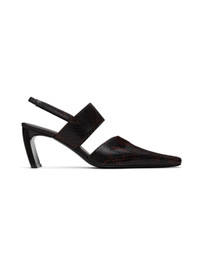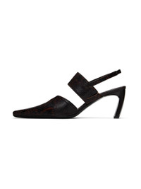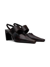 Snake-embossed calfskin mules in brown. · Square pointed toe · Cutout at vamp · Elasticized gusset and strap at vamp · Partially-elasticized slingback strap · Logo embossed at buffed leather footbed · Covered block heel with rubber injection · Leather sole · Heel: H2.75" Supplier color: Brown snake Calfskin. Made in Italy 242148F122000