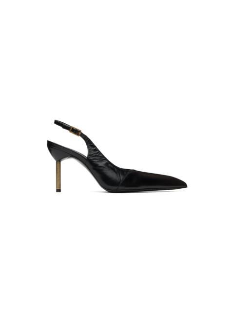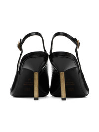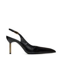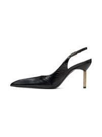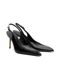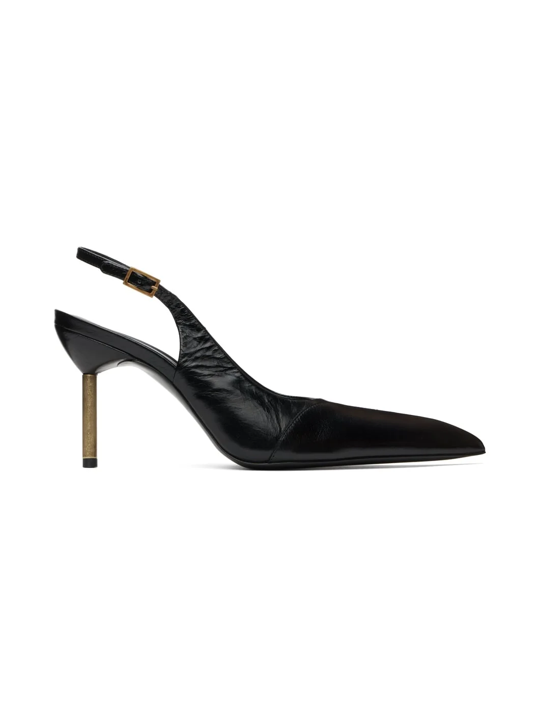 Handcrafted buffed and crinkled calfskin heels in black. · Pointed toe · Pin-buckle slingback strap · Logo embossed at padded leather footbed · Metal stiletto heel with rubber injection · Leather sole · Antiqued brass-tone hardware · Heel: H3.5" Supplier color: Black Upper: calfskin. Sole: leather, rubber. Made in Italy 242148F122002