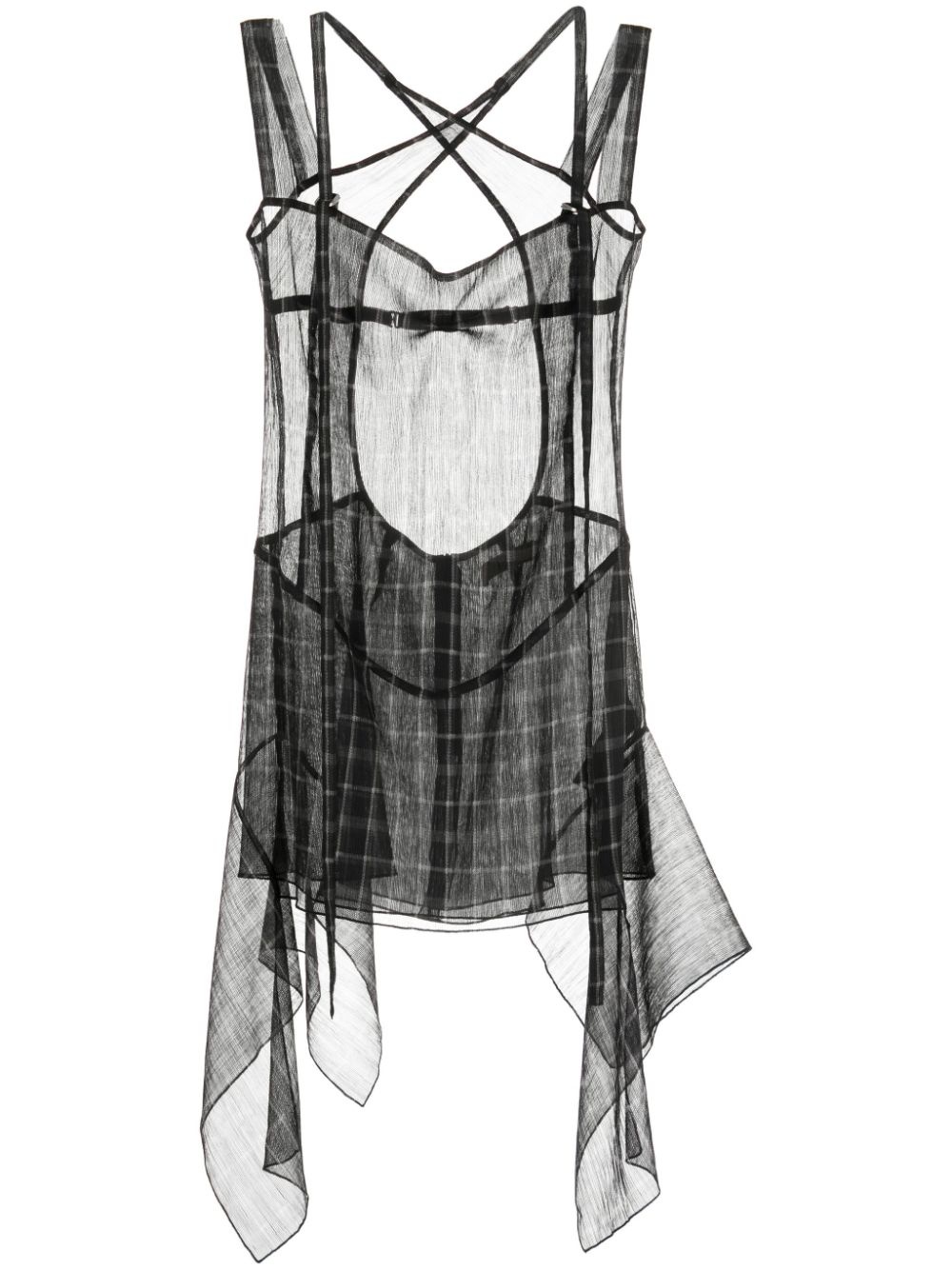 D-ring strap semi-sheer dress Highlights - Black - Semi-sheer construction - D-ring buckle fastening - Sleeveless - Crossover shoulder straps - Open back - Thigh-length - Straight hem Made in United Kingdom Composition Polyester 100% SIZE & FIT Model measurements Height 5 ft 10 in(1.77 m) Bust/Chest 30.3 in(77 cm) Hips 33.9 in(86 cm) Waist 25.2 in(64 cm) FittingInformation Designed for a slim fit that sits just away from the body offering a close yet comfortable fit Slightly short in length; consider your own measurements Made from a lightweight non-stretch fabric This piece fits true to size – take your usual size
