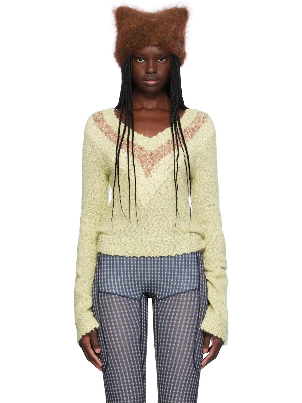 Knit slub mohair- and wool-blend boucle sweater. · Rib knit V-neck, hem, and cuffs · Stripes at V-neck · Extended cuffs Supplier color: Cream speck 36% mohair, 36% wool, 15% cotton, 13% nylon. Made in United Kingdom 242148F100000