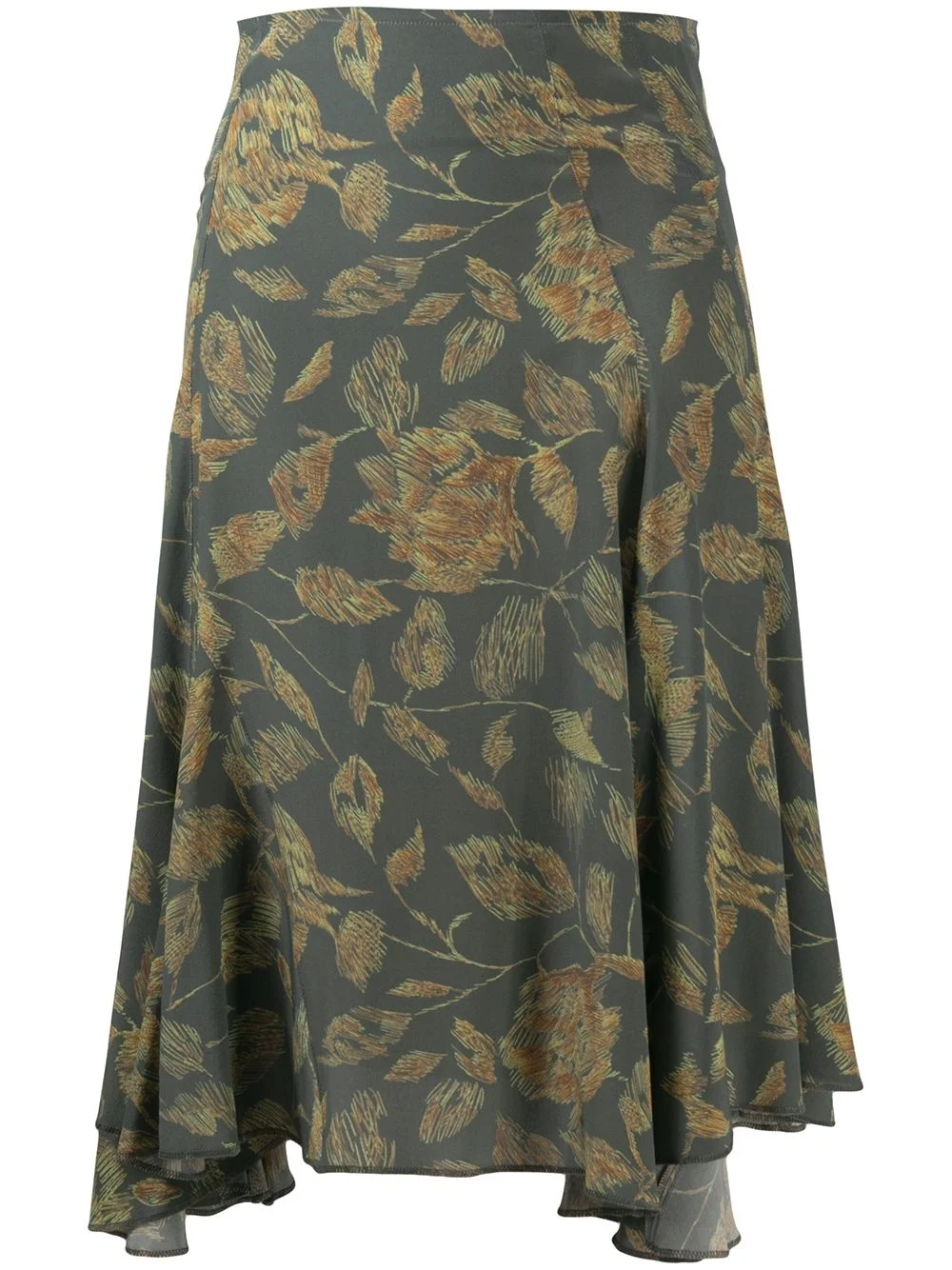 floral-print midi skirt Highlights - Dark green - Silk-blend - Asymmetric design - High waist - Floral print Made in United Kingdom Composition Silk 98%, Spandex/Elastane 2% SIZE & FIT Model measurements Height 5 ft 10 in(1.78 m) Bust/Chest 31.49 in(80 cm) Hips 36.22 in(92 cm) Waist 25.59 in(65 cm) FittingInformation This piece fits true to size. We recommend you get your regular size Designed to be fitted at the waist and hips, loose over the leg Made with a lightweight stretch fabric