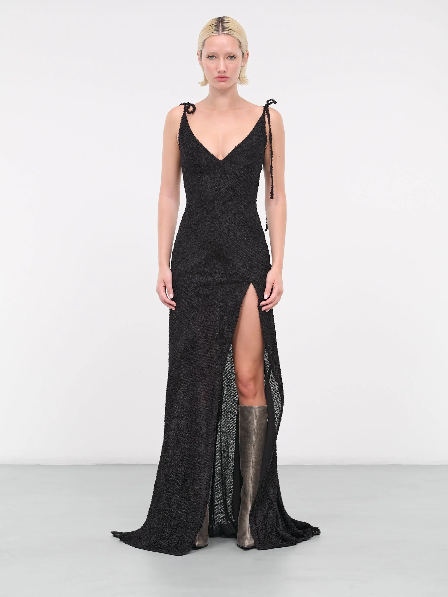 KNWLS dress in black, textured polyester open knit construction, plunging v-neckline, self-tie shoulder straps, open back, back concealed zip closure, deep leg slit, ruffled hem, short train, stretch nylon lined, floor-length, fitted. Made in UK Outer: 100% Polyester Inner: 83% Polyamide 17% Elastane UK Sizing Model is 5'9" wearing size 8. Bust: 32" Waist: 24" Hips: 34"