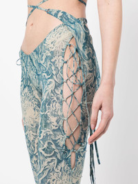 Glimmer graphic-print flared trousers Highlights - Blue - Silk blend - Low-rise - Cut-out detailing - All-over graphic print - Rear tie fastening - Flared Made in United Kingdom Composition Silk 92%, Polyester 8% SIZE & FIT Model measurements Height 5 ft 10 in(1.77 m) Bust/Chest 31.9 in(81 cm) Hips 33.9 in(86 cm) Waist 24 in(61 cm) FittingInformation Designed with a flared hem, these trousers allow for a close fit at the waist with a slim fit over the leg and widening towards the hem The tie fastening gives an adaptable and personalised fit Made from a lightweight stretch fabric, this piece offers elasticity and flexibility when worn This piece fits true to size – take your usual size