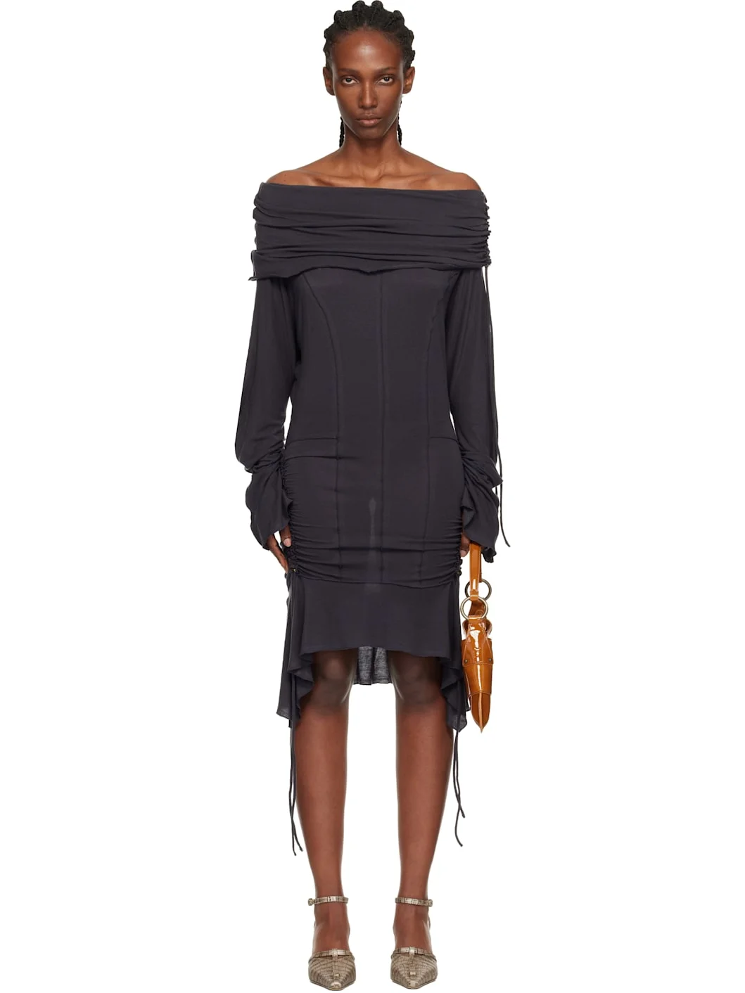 Stretch tencel-blend jersey minidress. · Exposed seams throughout · Off-the-shoulder construction · Foldover neck · Lettuce edge at hem and cuffs · Cord-lock drawstring at side seams Supplier color: Charcoal 85% tencel, 10% polyurethane, 5% cashmere. Made in United Kingdom 252148F052002