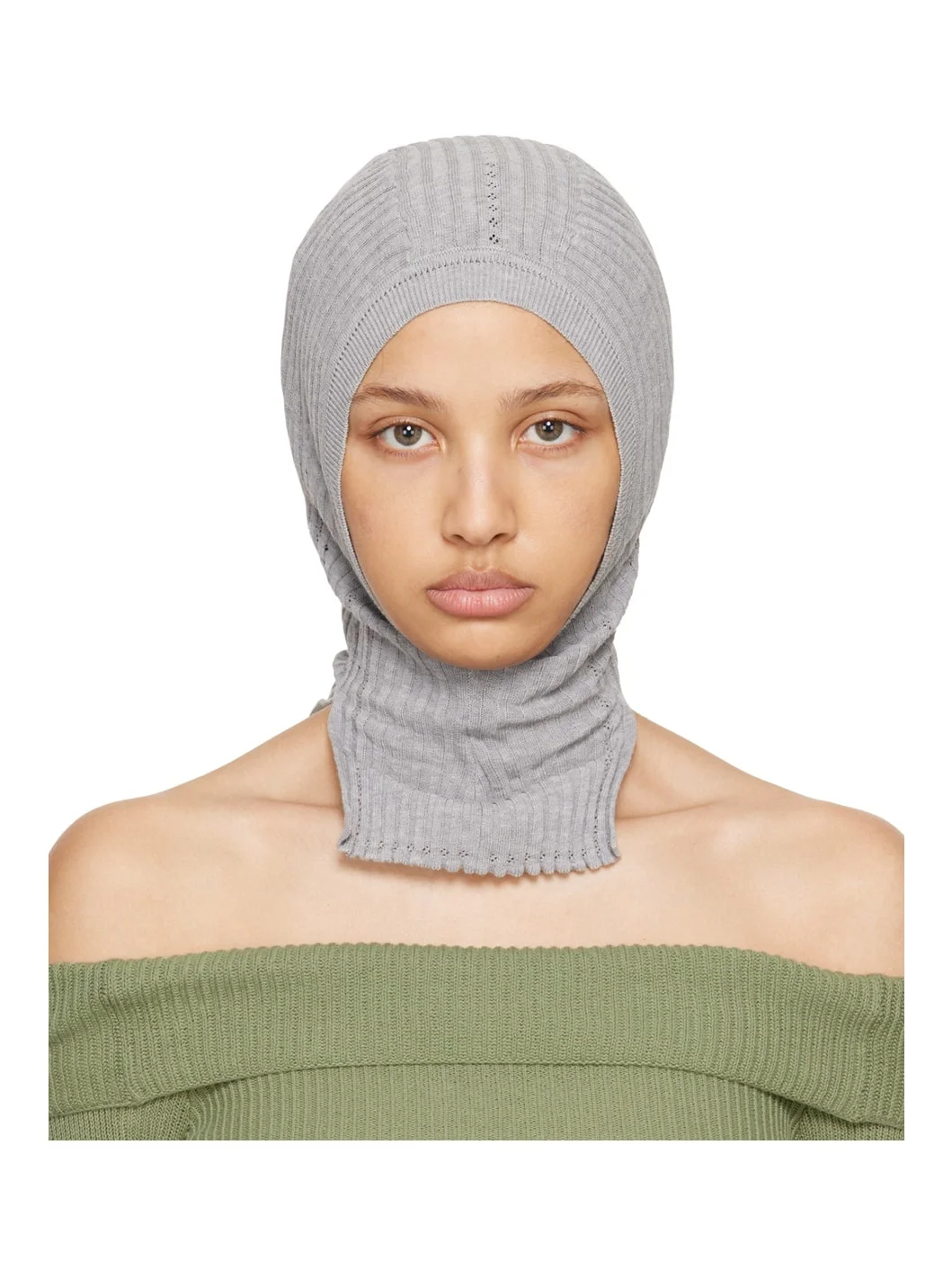 Rib knit cotton balaclava in gray. · Pointelle detailing throughout · Vents at collar Face masks and face coverings are final sale and are not eligible for return or exchange. Supplier color: Grey